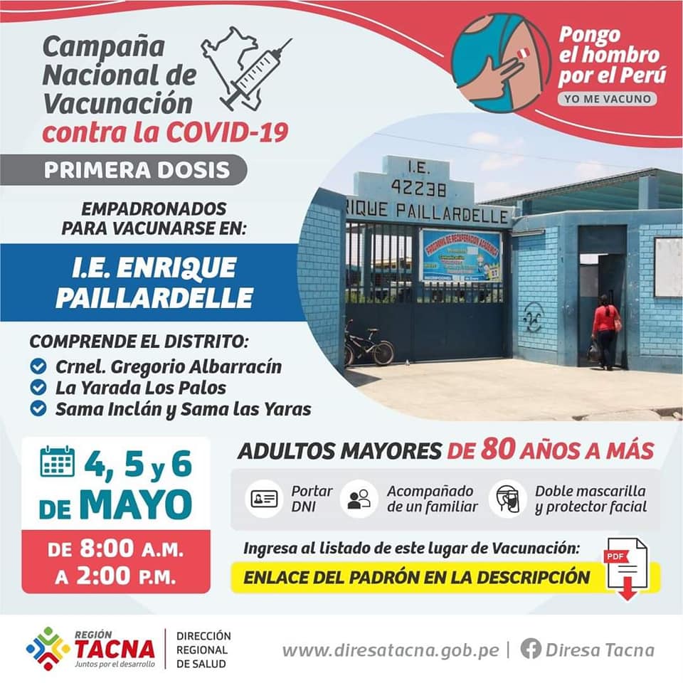 Serán cuatro los colegios en Tacna los puntos donde se inocule a los adultos mayores: I.E.E. Coronel Bolognesi; para aquellos que vivan en el cercado de Tacna, I.E. Manuel Flores Calvo; comprende a los adultos mayores de Pocollay, Calana, Pachia y Palca, I.E.Enrique Paillardelle para aquellos del distrito Cnel. Gregorio Albarracín, La Yarada Los Palos, Sama Inclán y las Yaras. Mientras que, la I.E.E.Don José de San Martín será para los que vivan en el distrito de Ciudad Nueva y Alto de la Alianza.