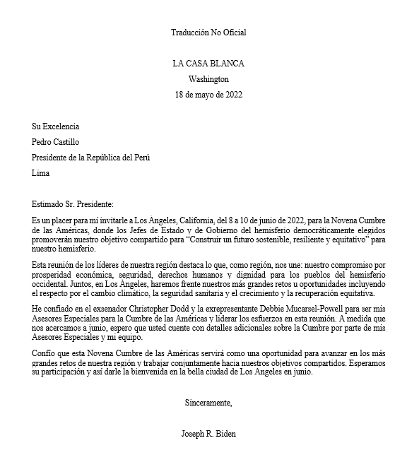 El presidente de Estados Unidos, Joe Biden, invitó a su homólogo peruano, Pedro Castillo, a la IX Cumbre de las Américas que se realizará del 8 al 10 de junio en la ciudad de Los Ángeles, California.